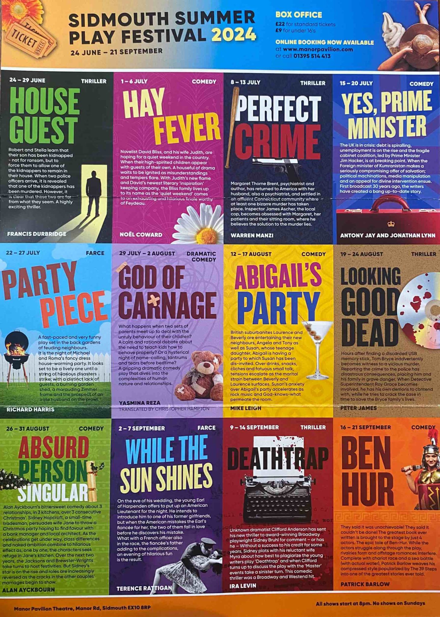 Thus we turn to the second half of 2024 – again, a mix of shows and performances; we wouldn’t want it any other way! JULY And so the Sidmouth Summer Season continued with Noel Coward’s HAY FEVER (Manor Pavilion …