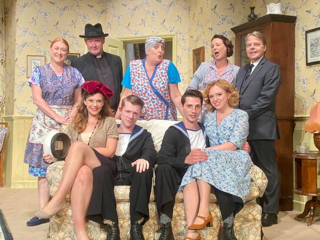 The day before the wedding of her daughter, Emma Hornett, bickers and battles with anyone in order to keep her home and family intact. Well, something along those lines. In Mrs Hornett, King and Cary created a monster – the archetypal battleaxe – a role made famous by the redoubtable actress Peggy Mount. It is a hugely demanding part at which Daniele Coombe excels; the scowls, the glares, the bellowing – a memorable character and a tremendous performance. Mrs Hornett manipulates all those around her including her sister-in-law – the dottie Edie – played to the hilt with great comic skill by Bridget Lambert. The opening scene between Edie and Emma engages immediately with its pace and business! Also subject to the sharp tongue of Emma is the original hen-pecked husband, Henry; James Pellow uses his considerable experience to squeeze every ounce of humour from the role – he offers a master class in the art of the short comic interjection. Emily Outred gives a wonderfully funny turn as the nosey neighbour, Mrs Lack, who won’t turn down the offer of a cup of tea even if she doesn’t want one – her angular performance is a joy. As the groom, Albert Tufnell, Matthew Hartley is tremendous; a wide-eyed, caring, cheeky chappie; it is a warm, engaging performance with more depth than one might initially imagine. He is matched by Gwithian Evans – complete with a wonderfully sonorous Scots accent – as fellow sailor, Carnoustie Bligh – a performance of great humour and accomplishment. Lexi Powell imbues the bride, Shirley, with a delightfully carefree innocence, torn between her love for her Mother and her fiancée and Holly Ashman plays the bridesmaid, Daphne, with a naughty twinkle in her eye and great charm. Bringing the whole story to its conclusion is Christopher Lyne as the Reverend Oliver Purefoy who received a round of applause as he pushed Mrs Hornett out of the room so he could reconcile the bride and groom.